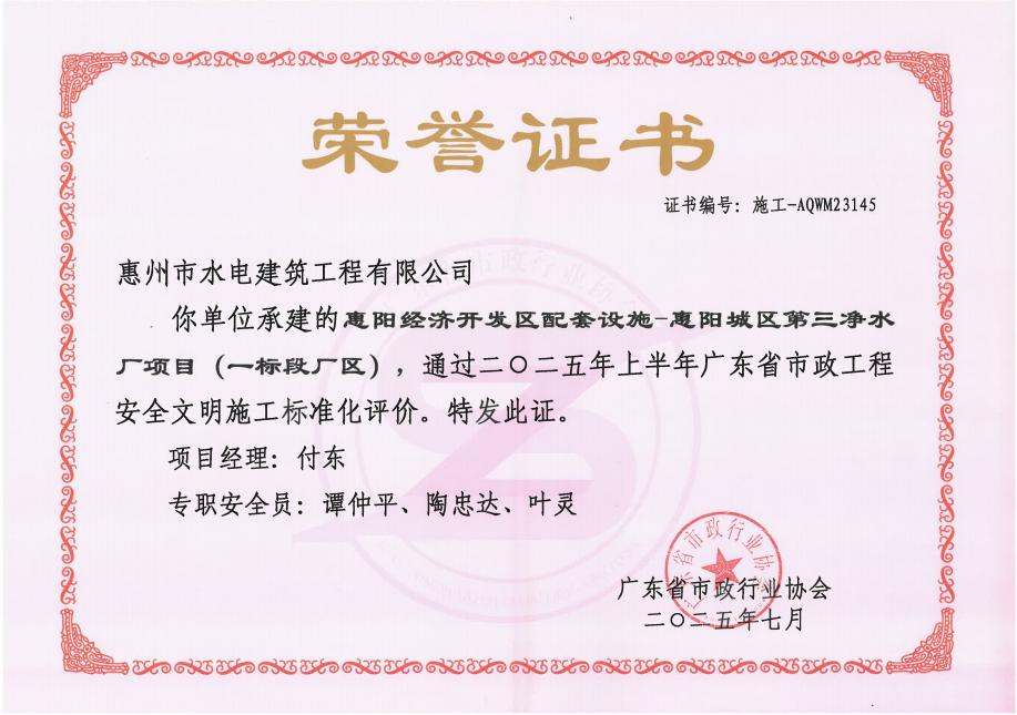 惠州市水電建筑工程有限公司成立于一九六四年四月,隸屬惠州市水務集團有限公司,是一家國有綜合性施工企業,主營水利水電工程、房屋建筑、市政工程等施工業務。公司擁有水利水電工程施工總承包一級、建筑工程施工總承包一級、市政公用工程施工總承包一級、公路工程施工總承包三級,公路路基、路面及建筑裝修裝飾專業承包二級,環(huán)保工程、機電安裝、河湖整治、輸變電工程專業承包三級等經營資質……